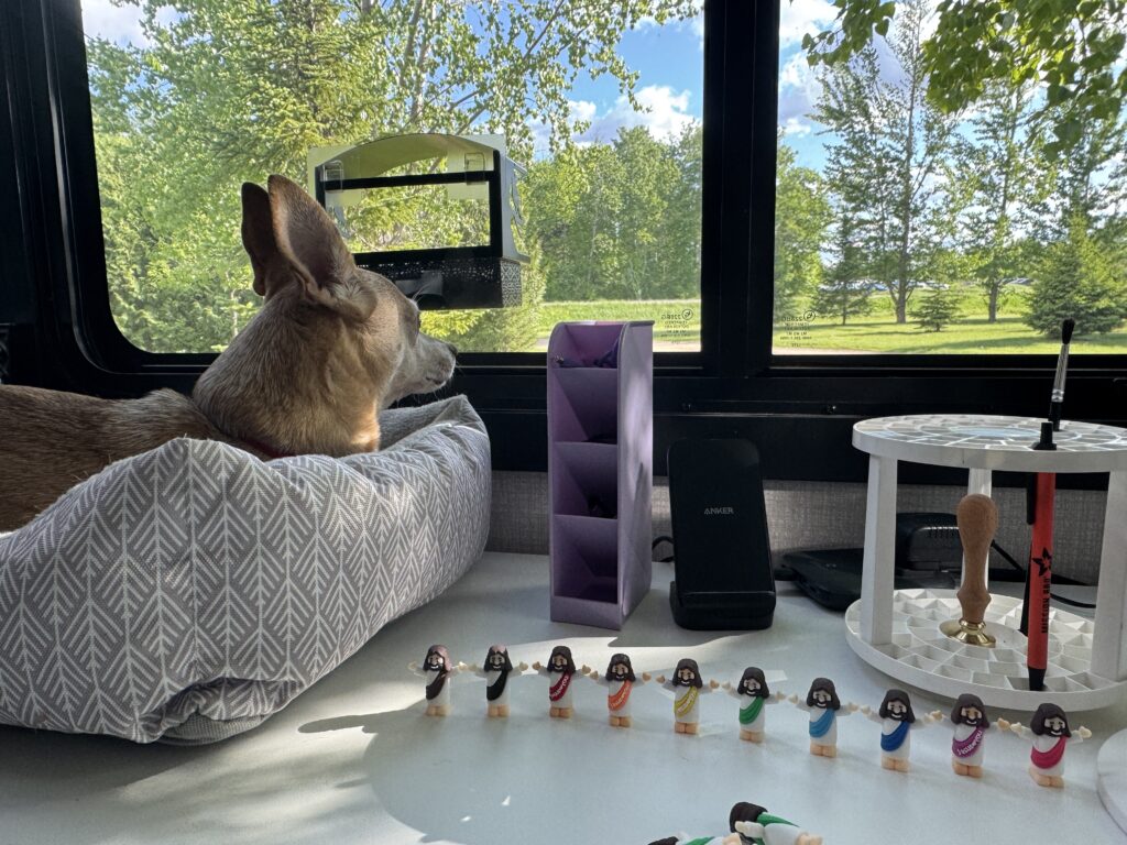 Here Scooby is enjoying his ‘perch’ on my desk, while I was sorting out my “Lil Jesus” in rainbow order. Ed ordered me 100 off Amazon. LOL! You can see the nice view we had, it is so green here!