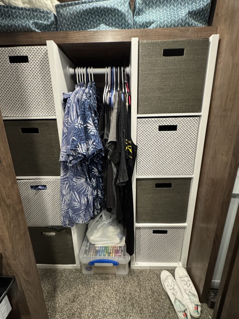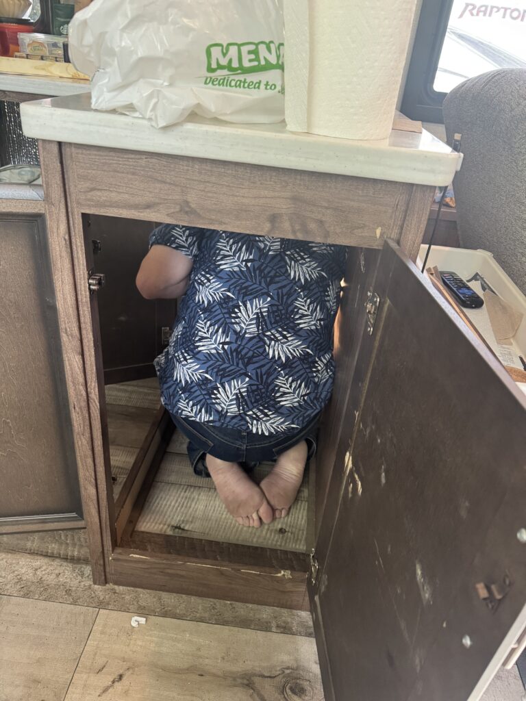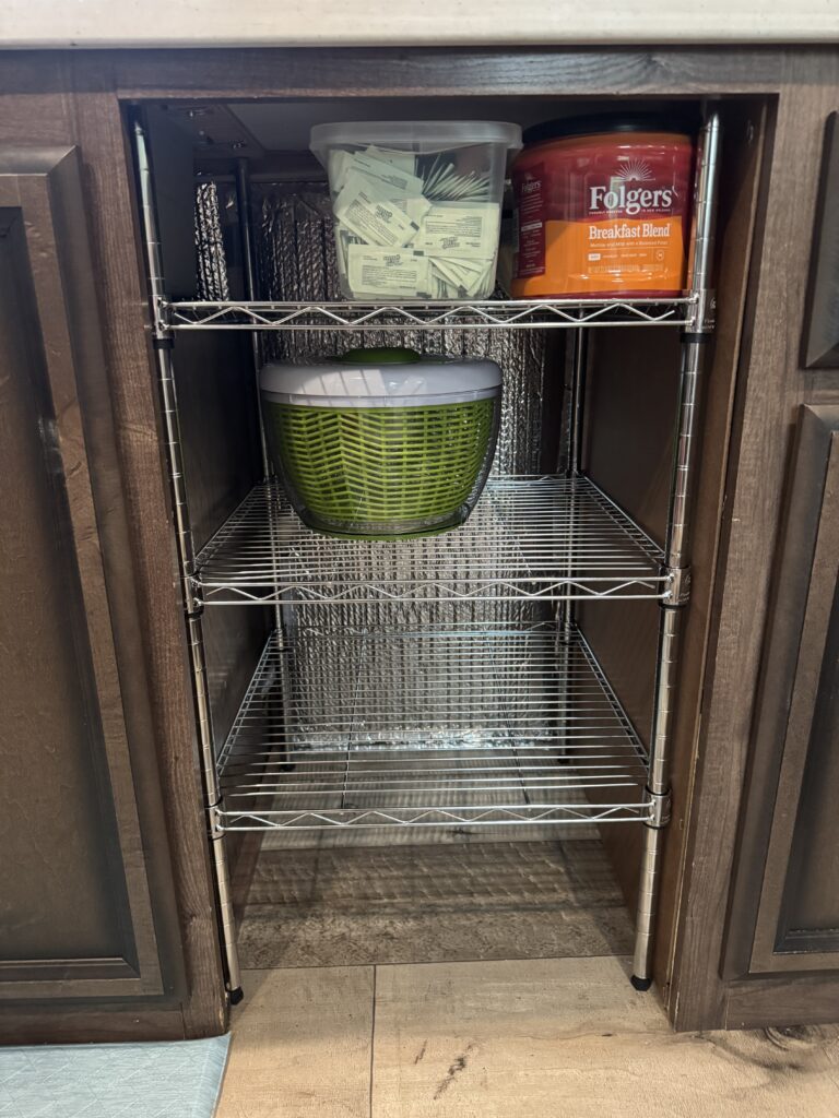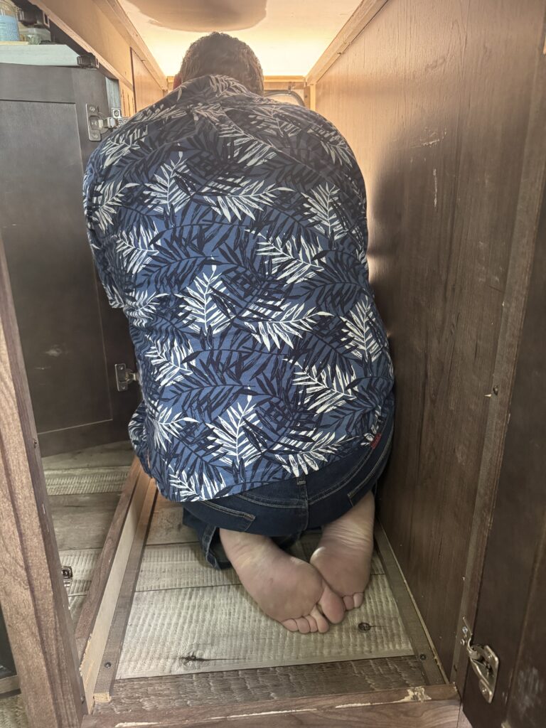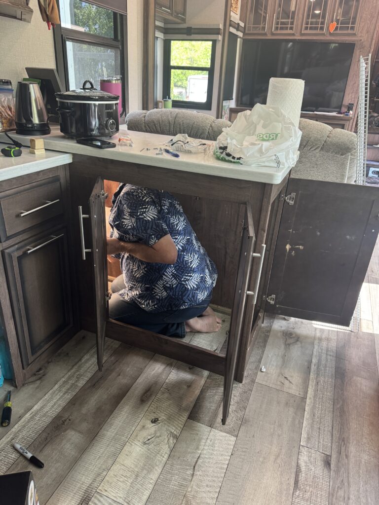 I decided that I didn’t like the pull out shelf in the bar area, so Ed gutted it and put in shelving for me. He also put shelving in the area where the dishwasher was removed. I am thrilled to have more efficient use of the area! I had to snap these photos of Ed all squished up in the space under the bar! LOL! We spent the first two weeks here upgrading the kitchen stuff. It was all worth it and I love how organized everything is now! We also organized and upgraded several things throughout the camper during our stay here. I swear Menard’s started contemplating putting us on the payroll, we were there so often.