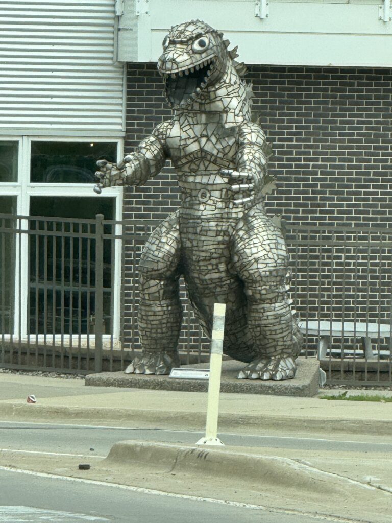 While driving around Mankato, probably heading to or from Menard’s, I spotted this Godzilla sculpture and thought of Michael and his love for all things Godzilla.
