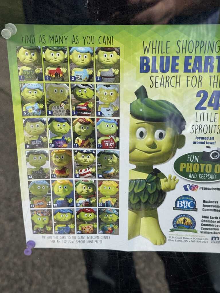 That same day, we drove out to see the Green Giant statue. They have a museum and a Sprout, also. The town has Sprout statues at various businesses all over town, they had a map at the museum that would take you to each of them. It would be fun for kids, but we were a bit tired from our day and decided to forgo hunting down the Sprouts.